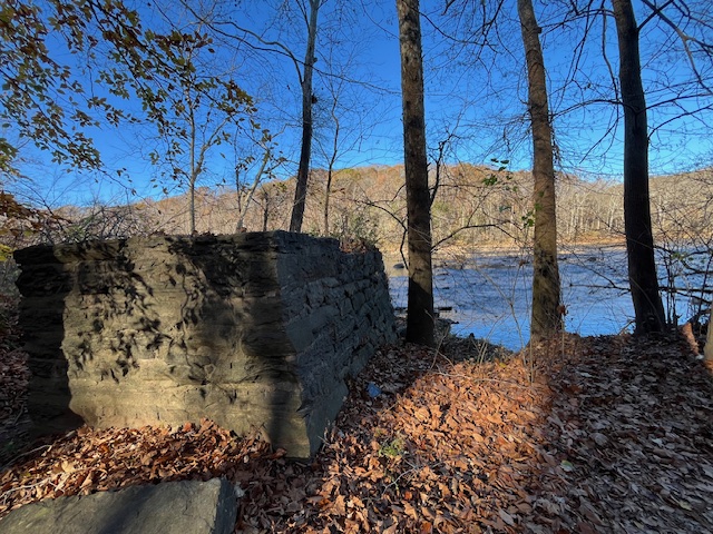 The stone dam abutment on the north side of the river becomes slightly visible in the winter months, when the leaves are down.