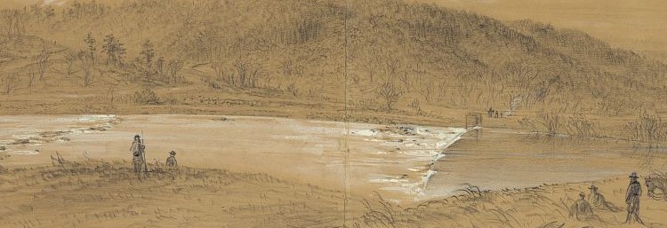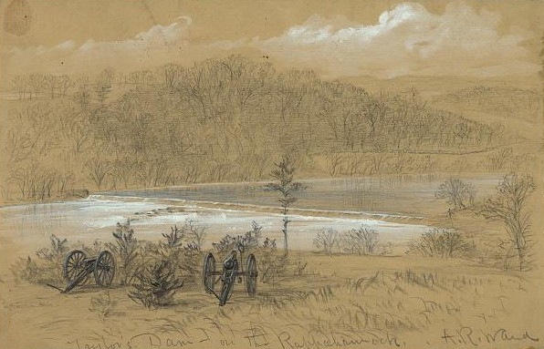 Sometime in early 1863, Alfred R. Waud sketched Taylor’s Dam from the north side of the Rappahannock River. This stone and timber river barrier was a component of the Rappahannock Navigation, a system of canals. locks, and dams that reached 55 miles upstream to Fauquier County. Construction had begun in 1829 at a turning basin in Fredericksburg. When completed in 1849, the system consisted of 15 miles of canal and 32 lift locks. The other 40 miles of navigation were in the river channel, across slack water ponds behind a series of 20 dams.