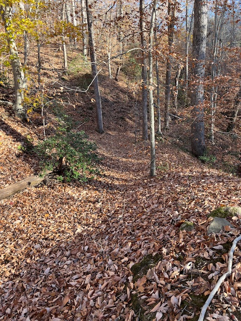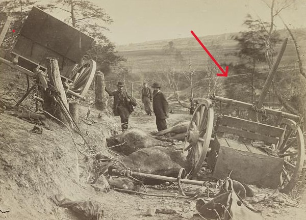 Russell exposed another image of the May 3 battleground on the reverse slope. The old road is within the National Park but not readily accessible. The red arrow points to an embankment on the east side of Haxel Run that is part of the unfinished railway that ran through this battlefield as well as through the contested ground at Chancellorsville and the Wilderness.