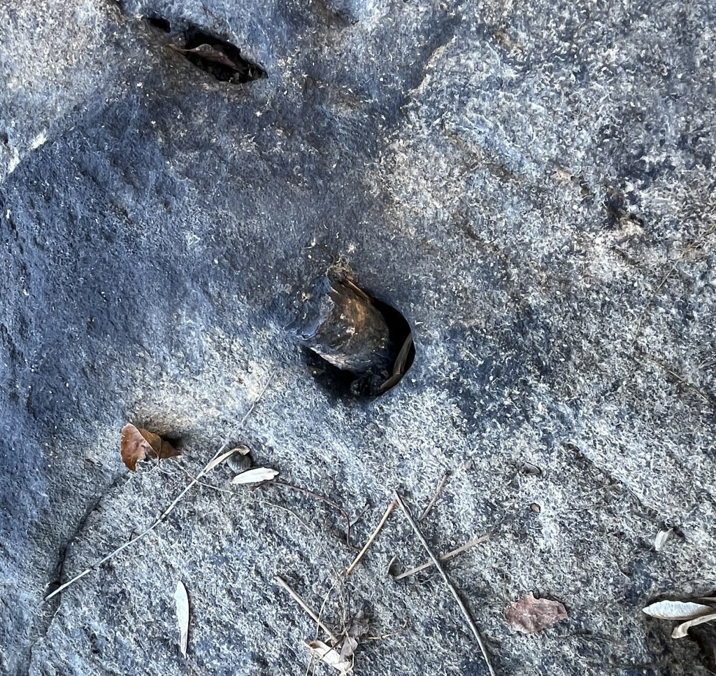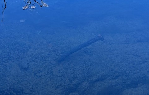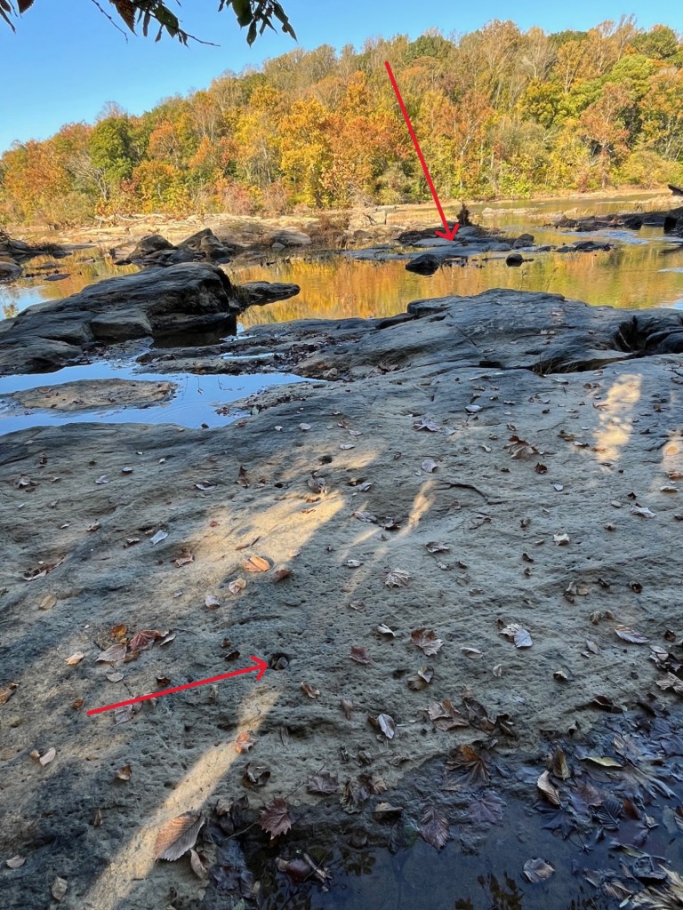 Taylor’s Dam angled across the river. Holes with broken spikes (lower arrow), a couple of intact but bent over spikes (upper arrow), and a stone abutment in the trees on the opposite shore reveal its exact location.