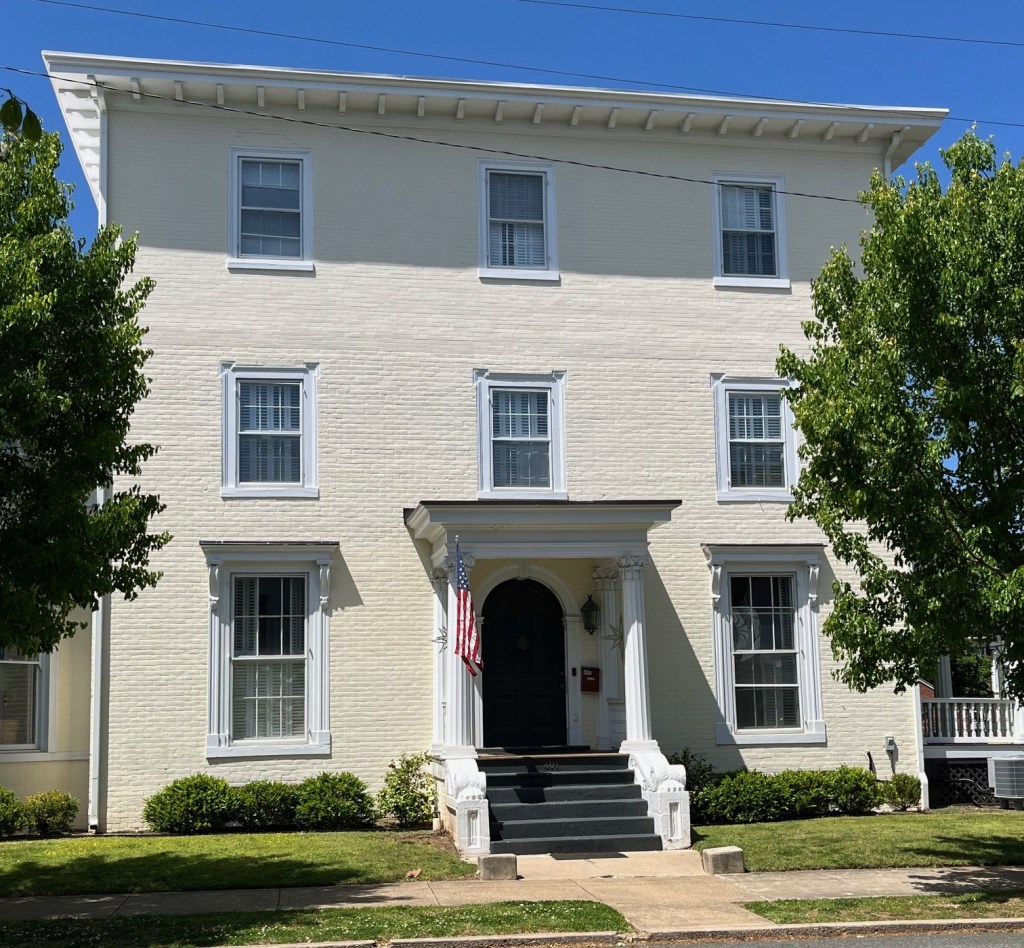 Alfred R. Waud executed the above sketch from the courthouse cupola during the 1862 Battle of Fredericksburg. The left arrow points to the Hanover Street home with two-story high columns, which is the building on the far right in this modern photo. Sedgwick’s headquarters was next door, in the middle building. The right arrow points to Federal Hill, as seen today to the right. Note that the Civil War sketch does not show any dormers. Those features were added in the 1920s, a time when wealthy individuals acquired historic homes and made them look more “Colonial.”