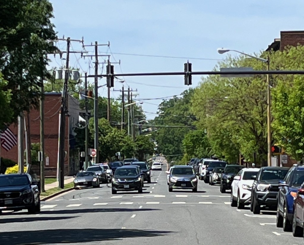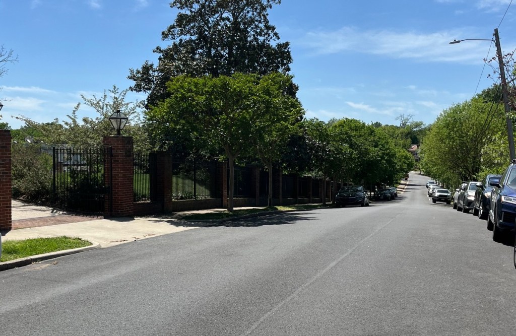 The intersection of William and Charles Streets, looking south along Charles Street. The open area under tree cover was a local cemetery in 1863. The assault troops could see the Hanover Street column two blocks away to their left,