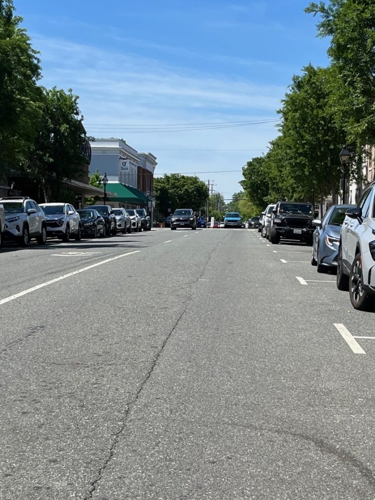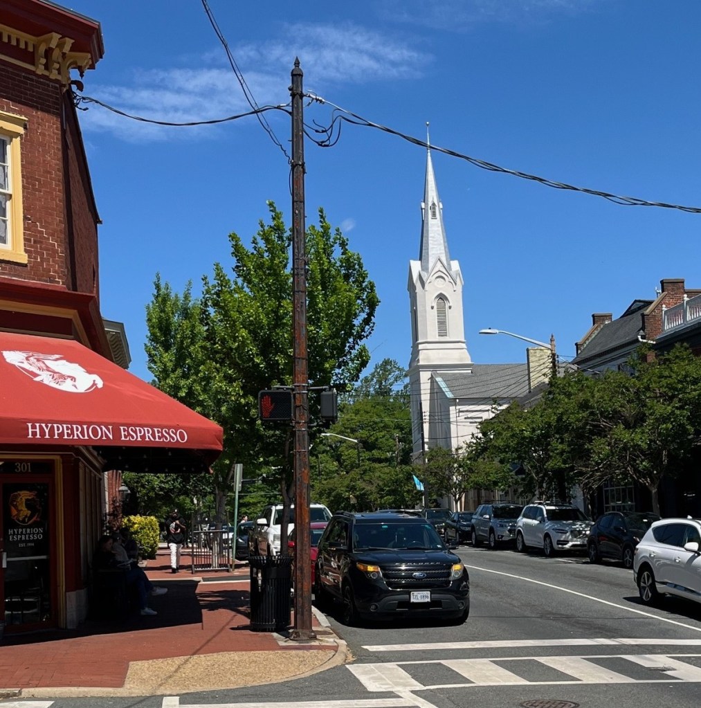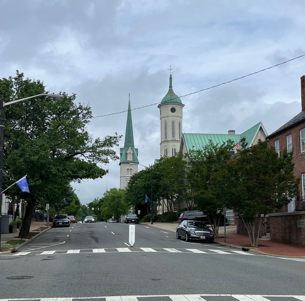 Intersection of William and Princess Anne Streets – in 2025 and 1864. View is looking west toward the Fredericksburg Baptist Church.