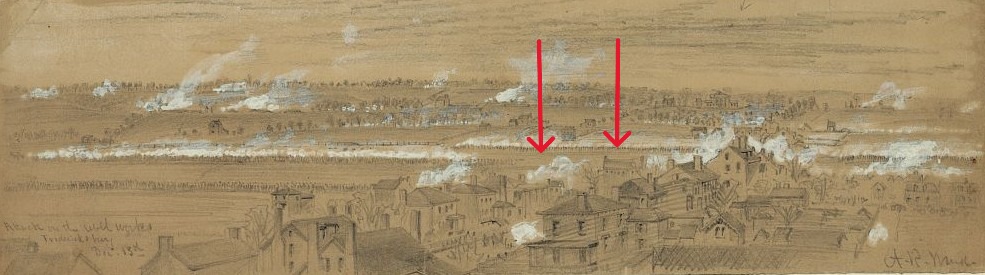 Prince Edward Street crosses William Street just past the cemetery noted above. That street constituted a rough urban edge in 1863. The dense blocks thinned out and there were only scattered buildings ahead. The Confederate position was still 1,150 yards away.