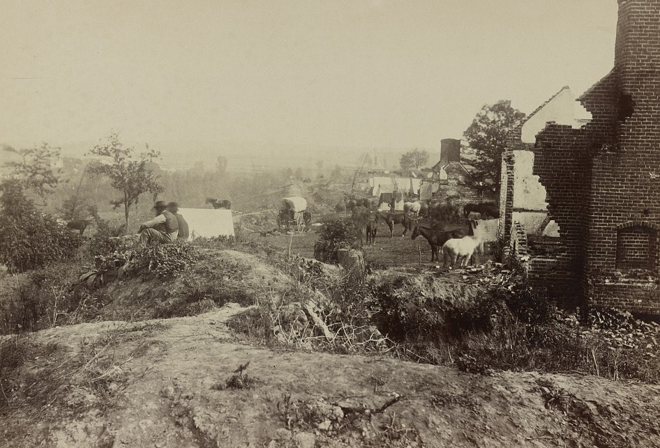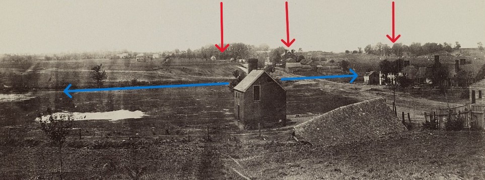 This 1864 panoramic photo was taken from the hilltop where Federal Hill stands. View is west toward Marye’s Heights. The blue line indicates where a canal drainage ran across the avenue of advance for any Union force coming out of Fredericksburg. The details indicated by the red arrows are described below.