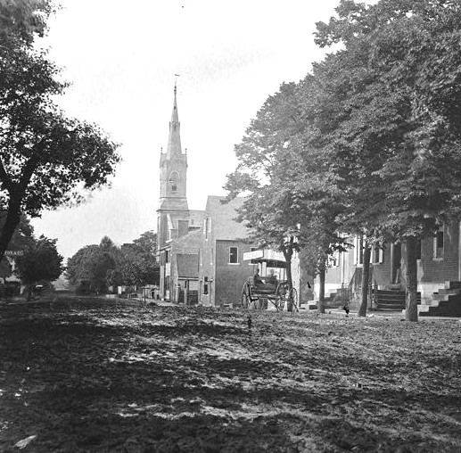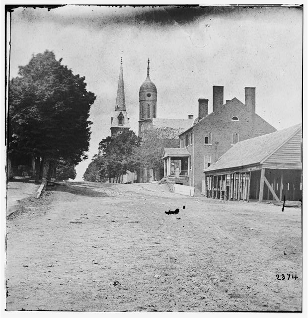 The intersection of Princess Anne and Hanover Streets in 2025 and 1864. View is looking north toward Fredericksburg’s courthouse and St. George’s Church. The courthouse, built by James Renwick in 1852, has a Gothic Revival design which is quite different from the traditional red brick/white column court houses found in most other Virginia localities.