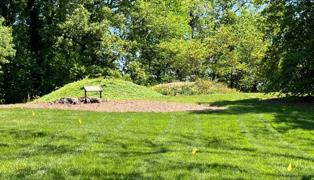 A section of 10-pounder Parrott rifles, manned by crews from Parker’s Richmond Battery, were in battery where the distant trees on the left now stand. As noted above, the many earthworks in this area were flattened to prepare the ground for burials.