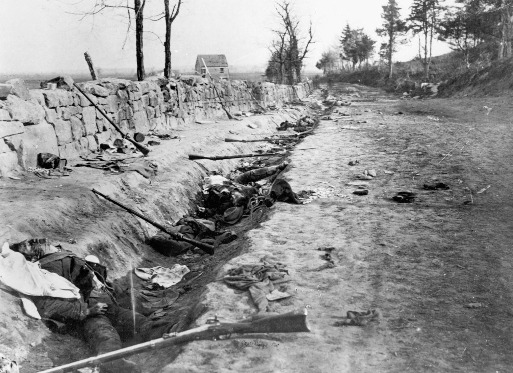 The 33rd New York, the 6th Vermont, and the 7th Maine had peeled off from their assault column, splashed across Hazel Run, and found themselves in defilade at the base of Marye’s Heights. The 33rd New York and 6th Vermont hustled to their left, sheltered by an unfinished railway embankment and then surged up the back of the hill. They emerged behind the Confederate batteries just as the 5th Wisconsin and 6th Maine also gained the hilltop. The 7th Maine had remained at the base of the hill and assisted in the capture of Mississippians trying to get away by following the Telegraph Road around the base of the hill.