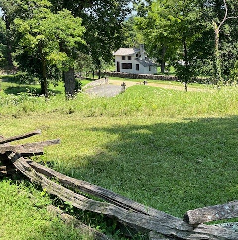 The Innis house, as seen from the Confederate perspective. The driveway perpendicular to the Telegraph Road (now called Sunken Road) is on National Park property and follows the draw to the hilltop. It used to provide access to a private school that once stood on the property. The private drive to the Brompton house is on the far left, slightly visible in the trees. The wood rails in the foreground are in front of what is left of a Confederate trench.