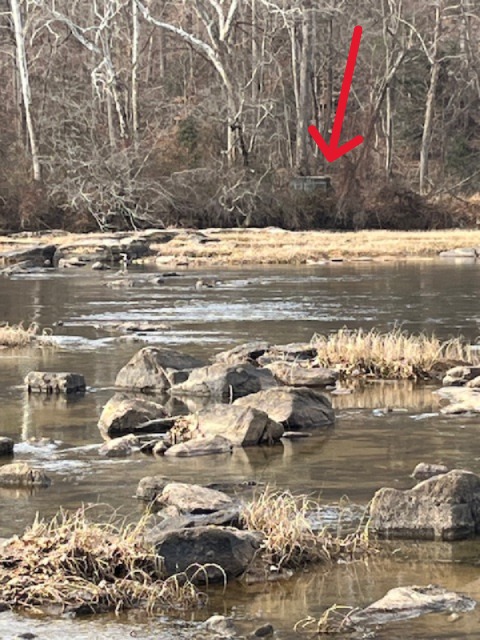 The site of Scott’s Mill as seen in January 2026. The stone foundation is all that remains of the wartime structure. The Rappahannock Navigation Canal is slightly upstream (to the right) and the ferry landing is just downstream (to the left). This photo was taken from the road that led to and from the ferry.